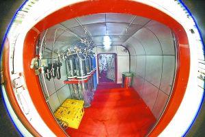 10月10日,在过渡舱门口拍摄的过渡舱和居住舱。日前,江苏蛟龙重工集团与华中科技大学共同研发并拥有自主知识产权的矿用移动式救生舱在江苏南通亮相。据介绍,该舱能够承受80米深的水压、1200℃的瞬时爆炸温度、每平方厘米8公斤的压力。救生舱限12人,舱内储存的食物可供他们生存120小时。救生舱还拥有无频发射系统,可在其400米范围内准确定位;拥有通讯系统,可以方便舱内外的沟通联系。新华社发